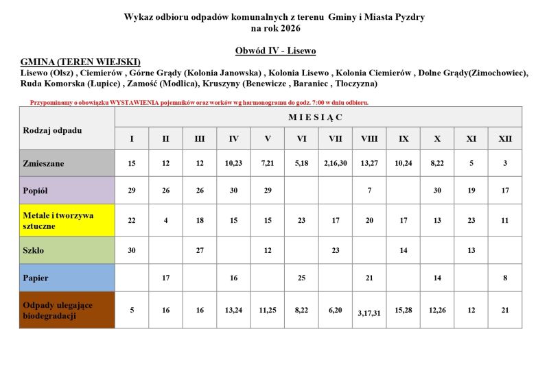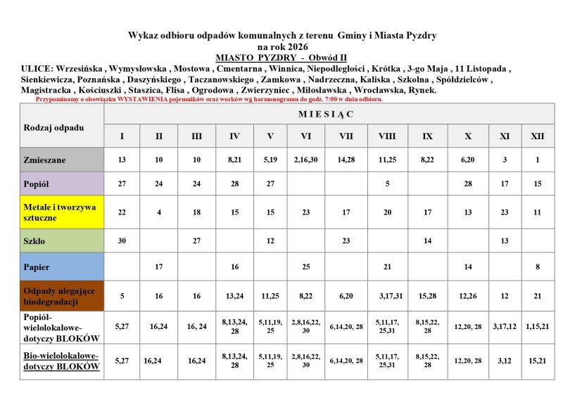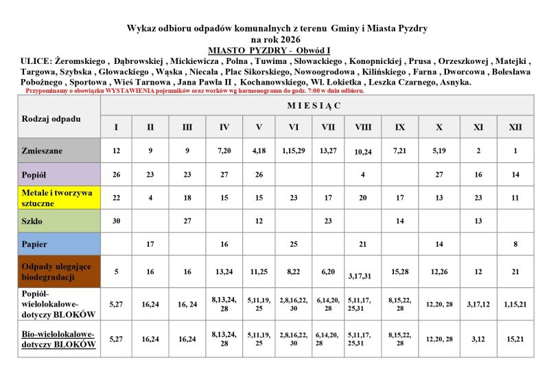 Harmonogram odbioru odpadów komunalnych na 2026 rok
