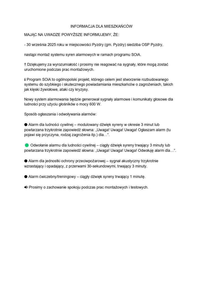 - 30 września 2025 roku w miejscowości Pyzdry (gm. Pyzdry) siedziba OSP Pyzdry, nastąpi montaż systemu syren alarmowych w ramach programu SOiA.