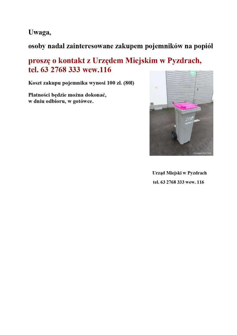 Osoby zainteresowane kupnem pojemnika na popiół, proszone są o kontakt z Urzędem Miejskim w Pyzdrach pod nr telefonu 63 2768 333 wewn. 116