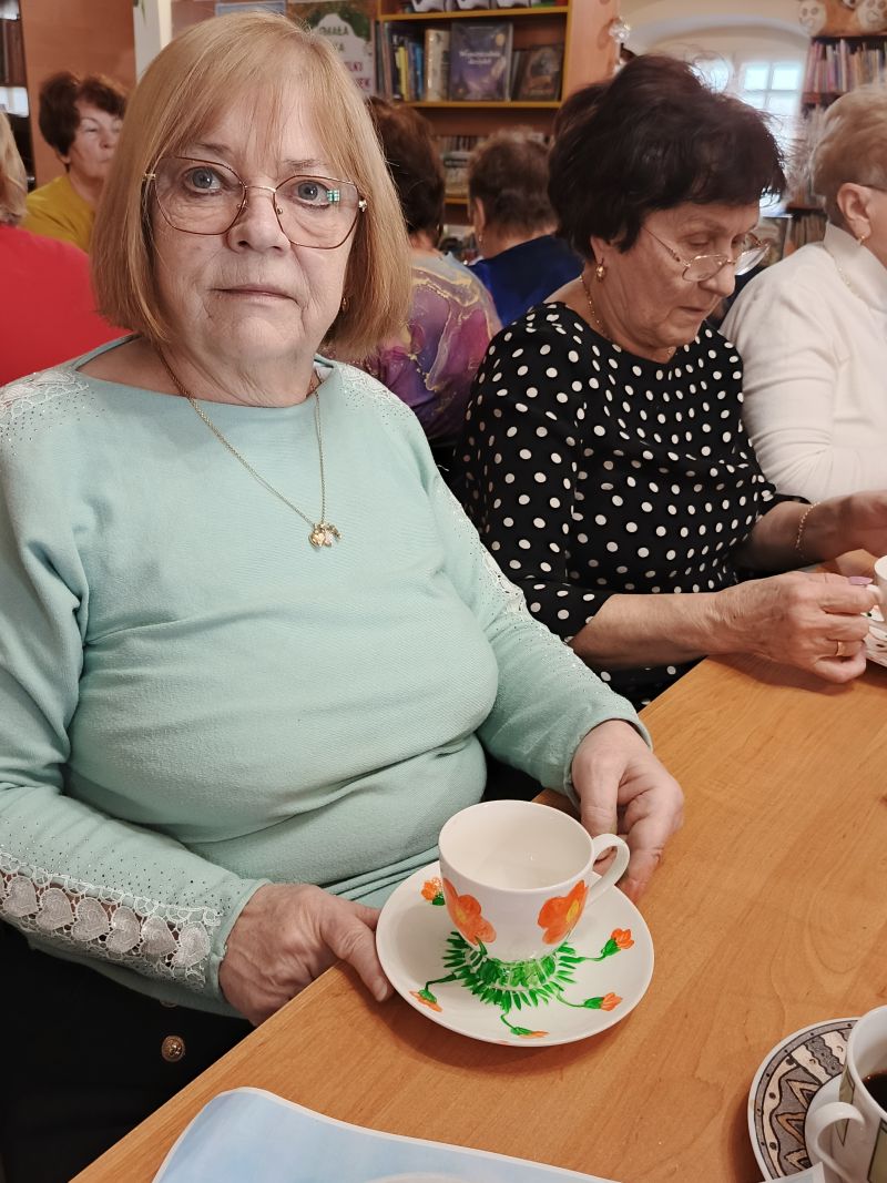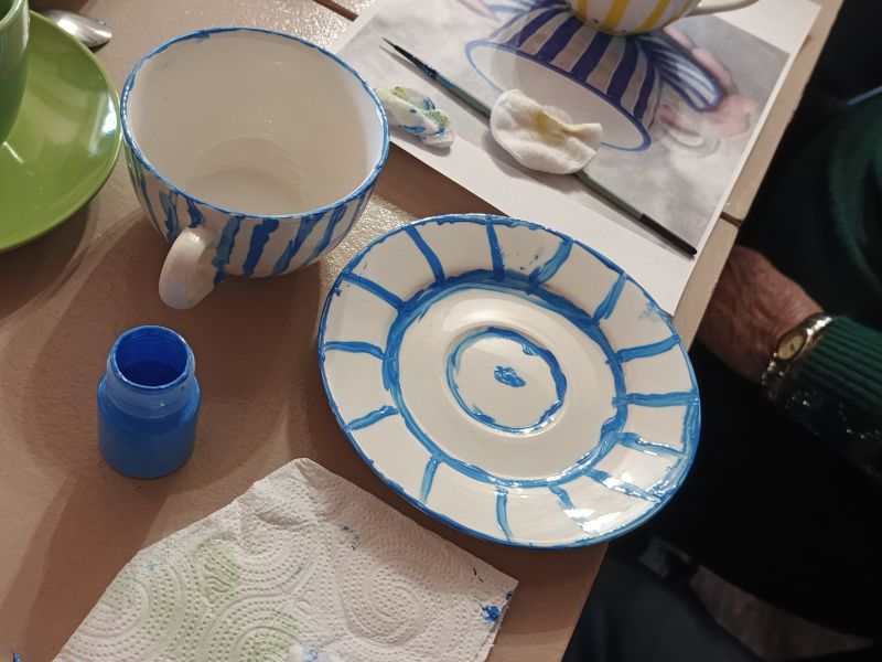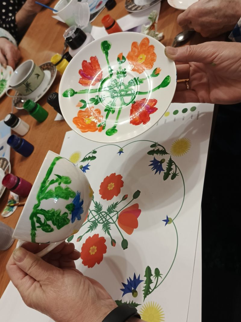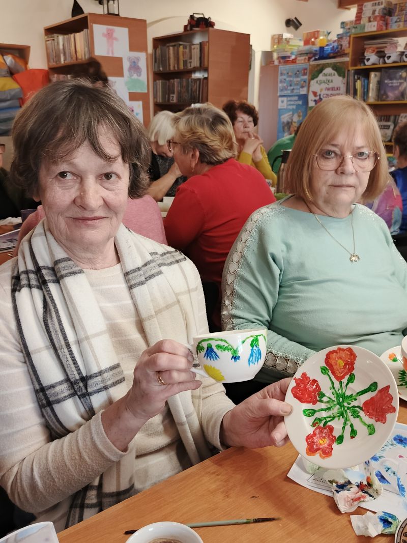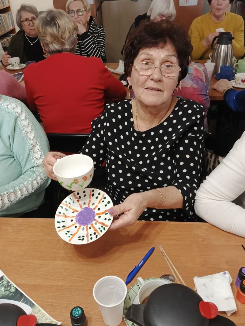 Warsztaty dla osób 60+, podczas których seniorzy mieli okazję własnoręcznie malować filiżanki.