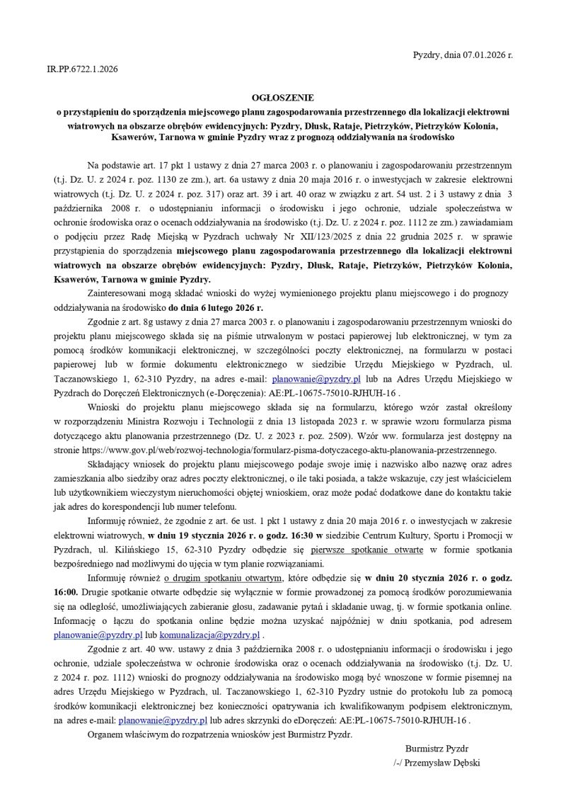 Ogłoszenie o przystąpieniu do sporządzenia miejscowego planu zagospodarowania przestrzennego dla lokalizacji elektrowni wiatrowych na obszarze obrębów ewidencyjnych: Pyzdry, Dłusk, Rataje, Pietrzyków, Pietrzyków Kolonia, Ksawerów, Tarnowa w gminie Pyzdry wraz z prognozą oddziaływania na środowisko
