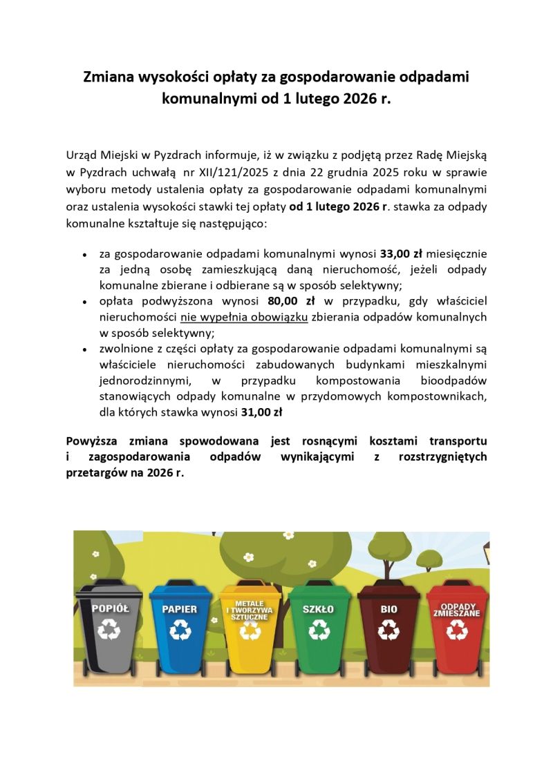 Urząd Miejski w Pyzdrach informuje, iż w związku z podjętą przez Radę Miejską w Pyzdrach uchwałą nr XII/121/2025 z dnia 22 grudnia 2025 roku w sprawie wyboru metody ustalenia opłaty za gospodarowanie odpadami komunalnymi oraz ustalenia wysokości stawki tej opłaty od 1 lutego 2026 r. stawka za odpady komunalne kształtuje się następująco: