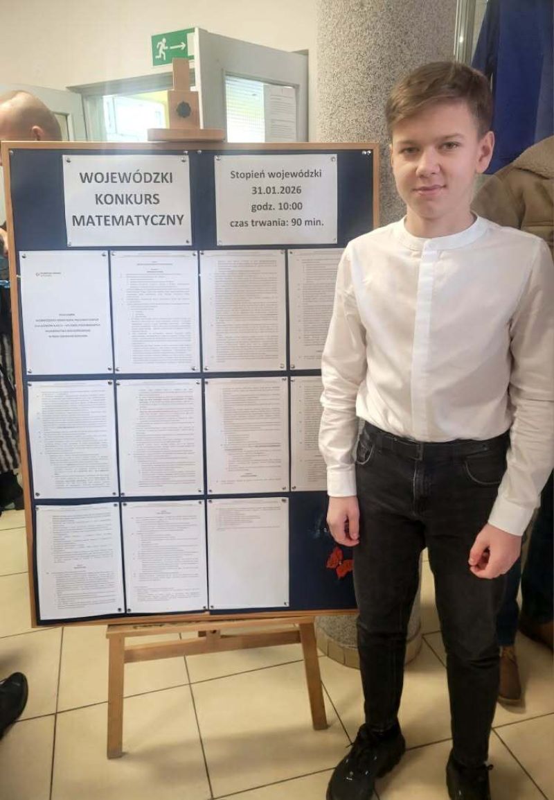Szymon Włodarczyk, uczeń klasy 8b Szkoły Podstawowej im. Jana Pawła II uzyskał tytuł Finalisty Wojewódzkiego Konkursu Matematycznego. To prestiżowe wyróżnienie jest efektem wielomiesięcznej, ciężkiej pracy, pasji do nauk ścisłych oraz ogromnej determinacji. Szymon, gratulujemy i życzymy dalszych sukcesów w odkrywaniu tajemnic matematyki!