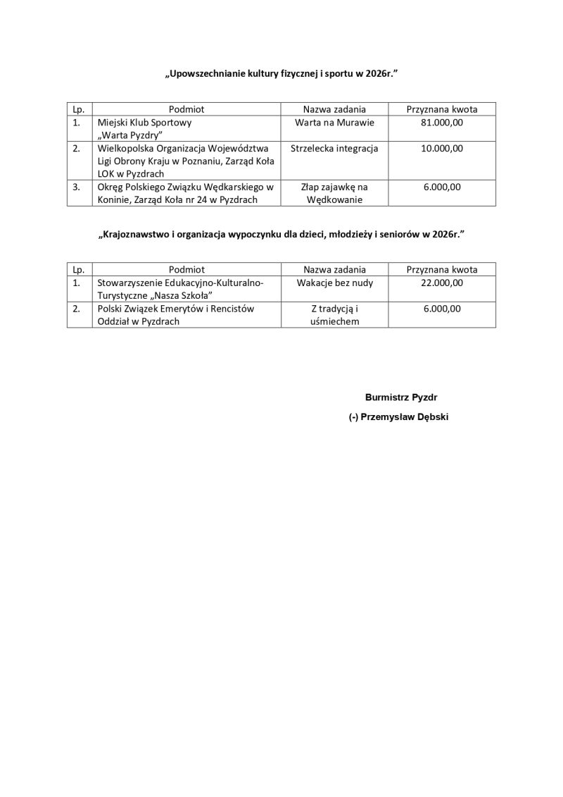 Burmistrz Pyzdr po zapoznaniu się z rekomendacją Komisji Konkursowej, zatwierdza do realizacji zadania w działach „Podtrzymania tradycji narodowej, pielęgnowania polskości oraz rozwoju świadomości narodowej, obywatelskiej, kulturalnej i umacnianie tożsamości europejskiej w 2026r.”, „Upowszechnianie kultury fizycznej i sportu w 2026r.” oraz „Krajoznawstwa i organizacji wypoczynku dla dzieci, młodzieży i seniorów w 2026r.”. Przyznanie dotacji  nastąpi w drodze umów, które określają szczegółowe prawa i obowiązki stron.